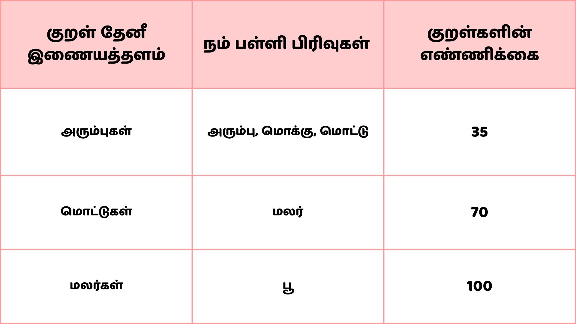 - The number of Kurals for each group is listed below. Please ensure this matches our school group classifications. For example, Arumbu, Mokku, and Mottu students are required to memorize 35 Kurals, which corresponds to the Arumbugal category on the Kural Theni website.